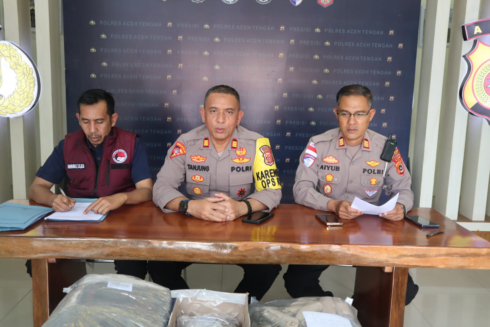 Press release dipimpin oleh Kapolres Aceh Tengah AKBP Muhamad Taufiq, S.I.K., M.H., yang diwakili Kabag Ops AKP Hendra Gunawan Tanjung, S.H., didampingi Kasat Resnarkoba AKP Fakhrurrazi, S.Si., MSM., serta Kasat Lantas AKP Aiyub, S.E., M.H.